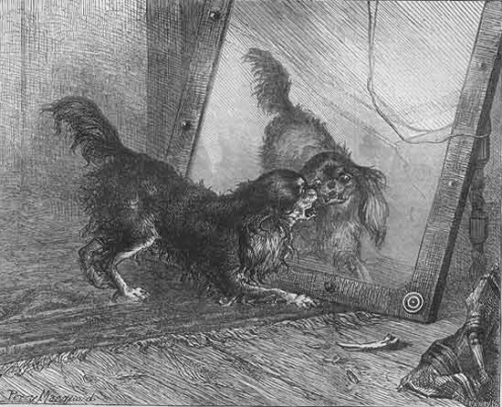 Собака оскалила зубы, и отражения ответили ей тем же. Перепугавшись не на шутку, она отчаянно залаяла. Эхо не отставало. Собака металась, кусая воздух, и её отражения тоже носились вокруг, щелкая зубами.